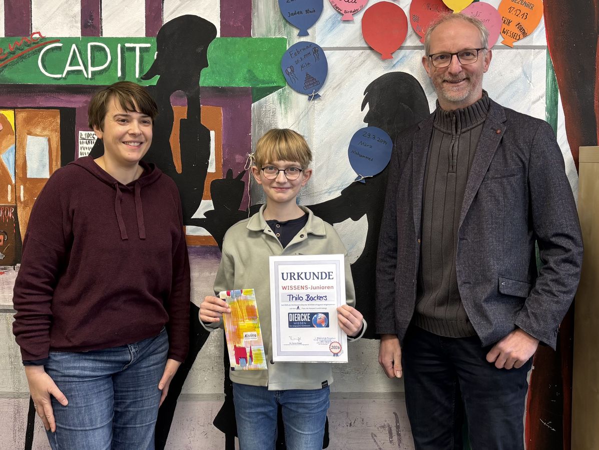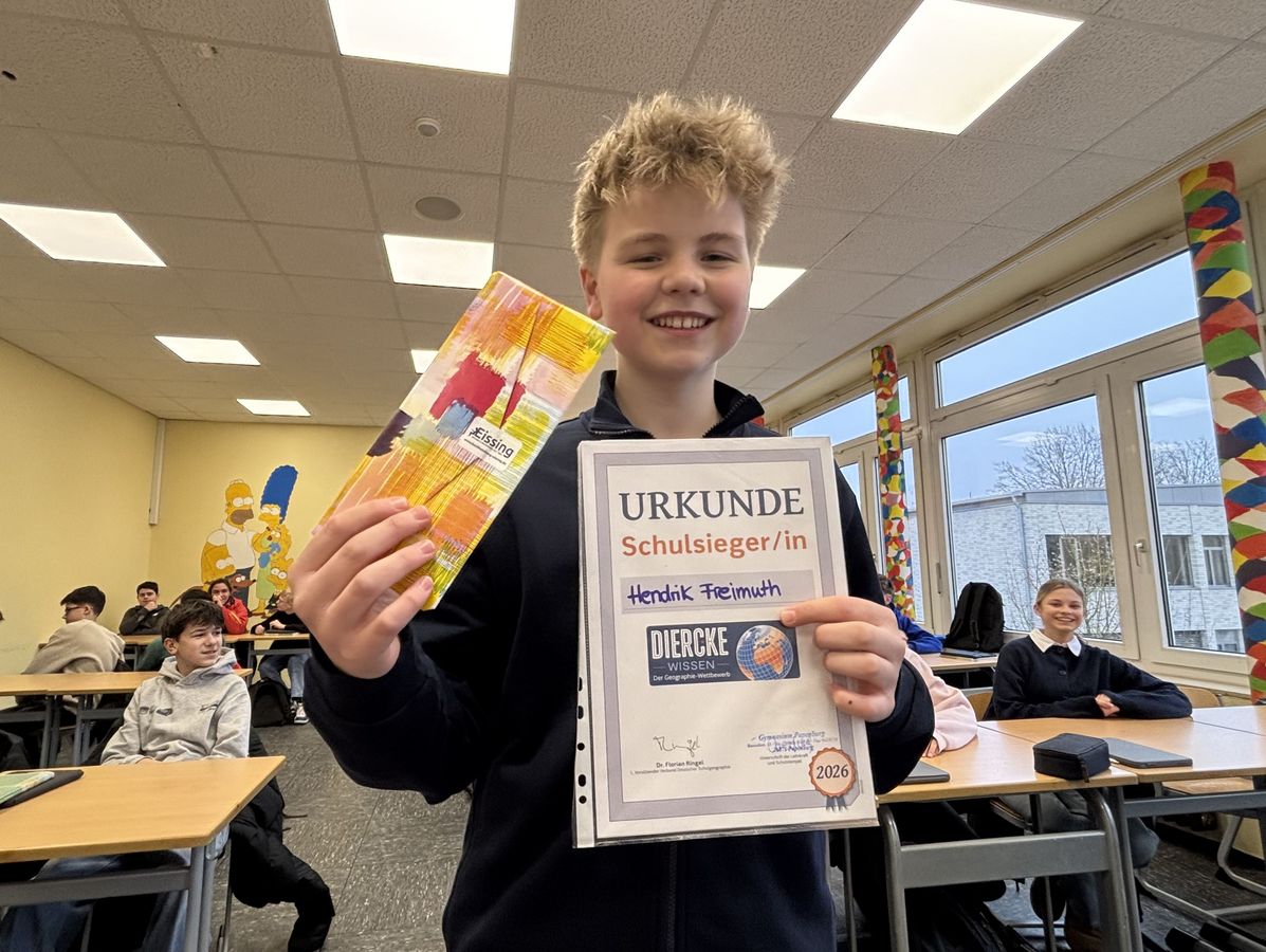 Beim Hauptwettbewerb freuen sich Sandro Schade über einen 3. Platz und Jonathan Drebber über „Silber“. Der Schulsieger 2026 mit 22 Punkten kommt aus der NaWi-Profil-Klasse 8d und heißt Hendrik Freimuth. Er vertritt unsere Schule auf Niedersachsen-Ebene. Die Fachschaft Erdkunde wünscht ihm viel Erfolg (und wünscht sich für nächstes Jahr eine höhere Beteiligung beim Hauptwettbewerb).
