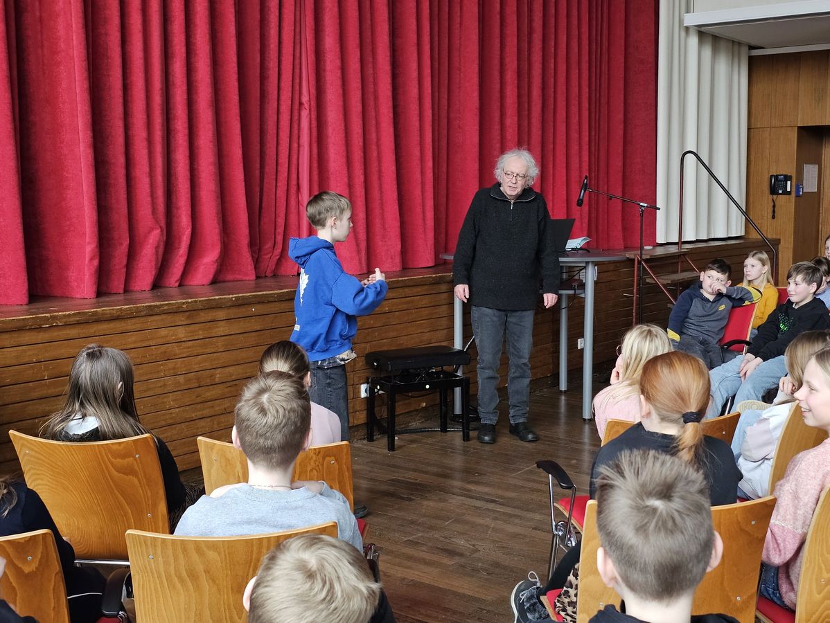 Zum Schluss forderte Herr Vogelwaid die Schülerinnen und Schüler zu einem kleinen Duell auf: Bei den vorherigen Märchen durften die Kinder den Anfangs- und Schlusssatz eines jeden Märchens mitsprechen, bei dem letzten Märchen durften sie jedoch keinen Mucks von sich geben. Mit einigen Tricks versuchte Eberhard Vogelwaid das Publikum aus der Reserve zu locken, aber die Schülerinnen und Schüler schafften es durch kluges Agieren, den kleinen Wettkampf zu gewinnen: Ein Schüler griff nämlich selbst zur Pantomime!